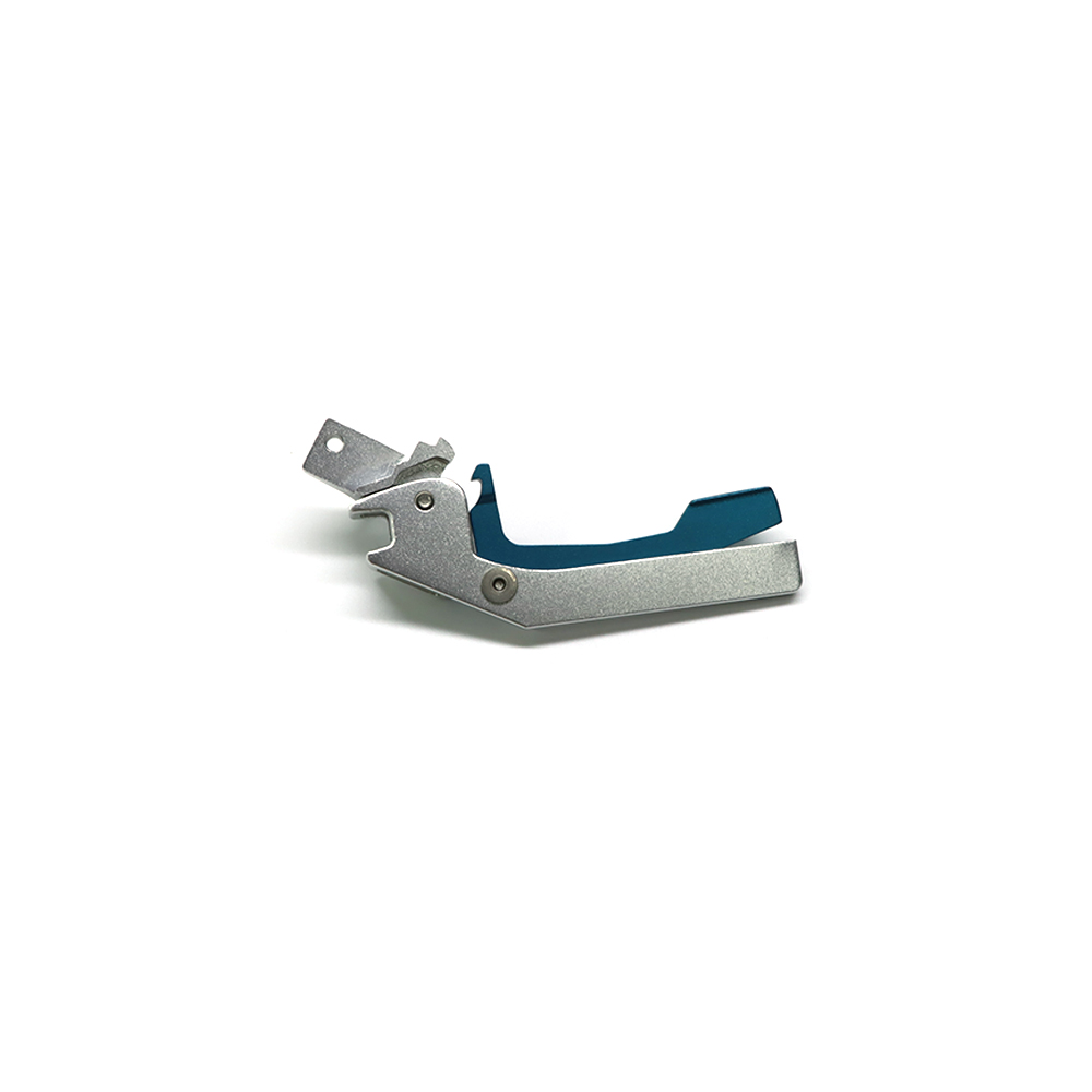 CNC Milling part is a stainless steel connector with L-shaped structure. The main body is made of silver-plated metal material and the surface has been finely polished to have a uniform matte texture; One end is equipped with several mounting holes and loop structures, while the other end extends with blue plastic or coated components. The overall design is compact, combining strength and functionality, suitable for fast connection and locking scenarios in precision devices.